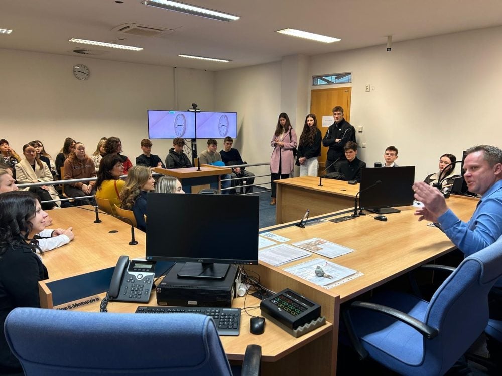 Prohlídka vyvrcholila v soudní síni, kde jsme se zúčastnili simulovaného soudního jednání, které bylo živě vysíláno. Simulaci vedl předseda soudu Mgr. Tomáš Pavlíček spolu s aktéry případu týkajícího se nezaplacené zápůjčky.