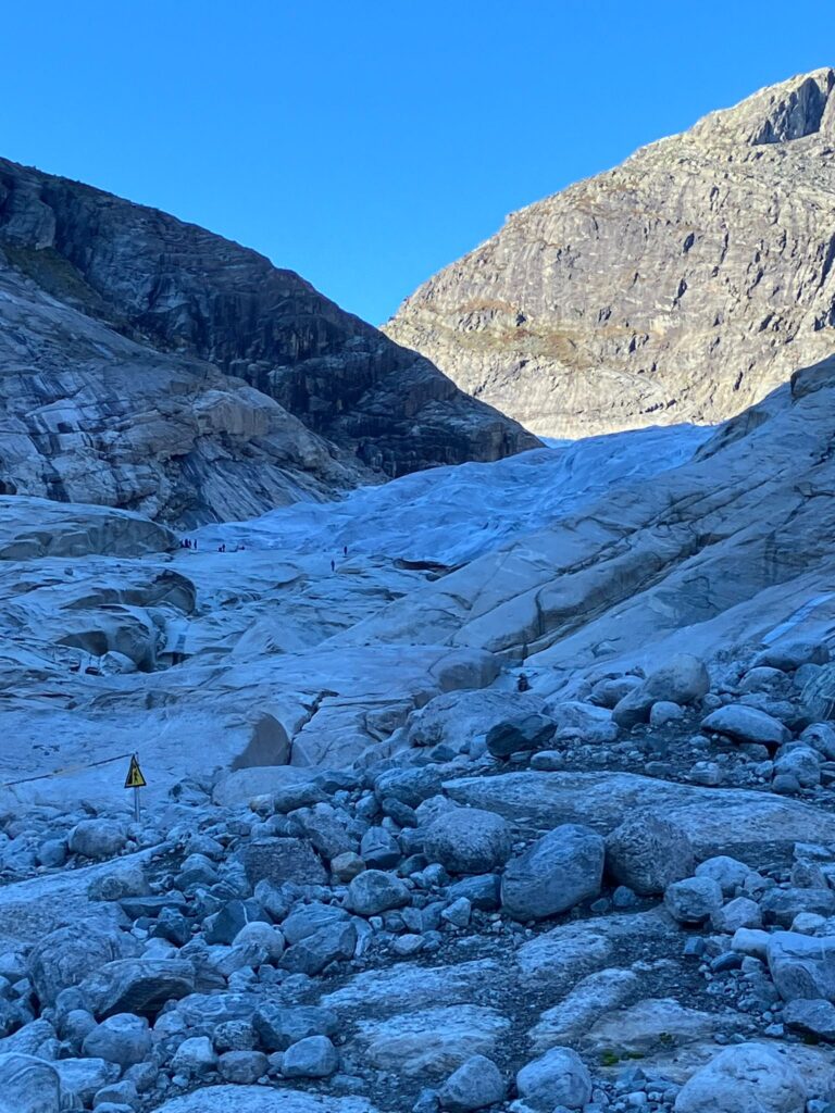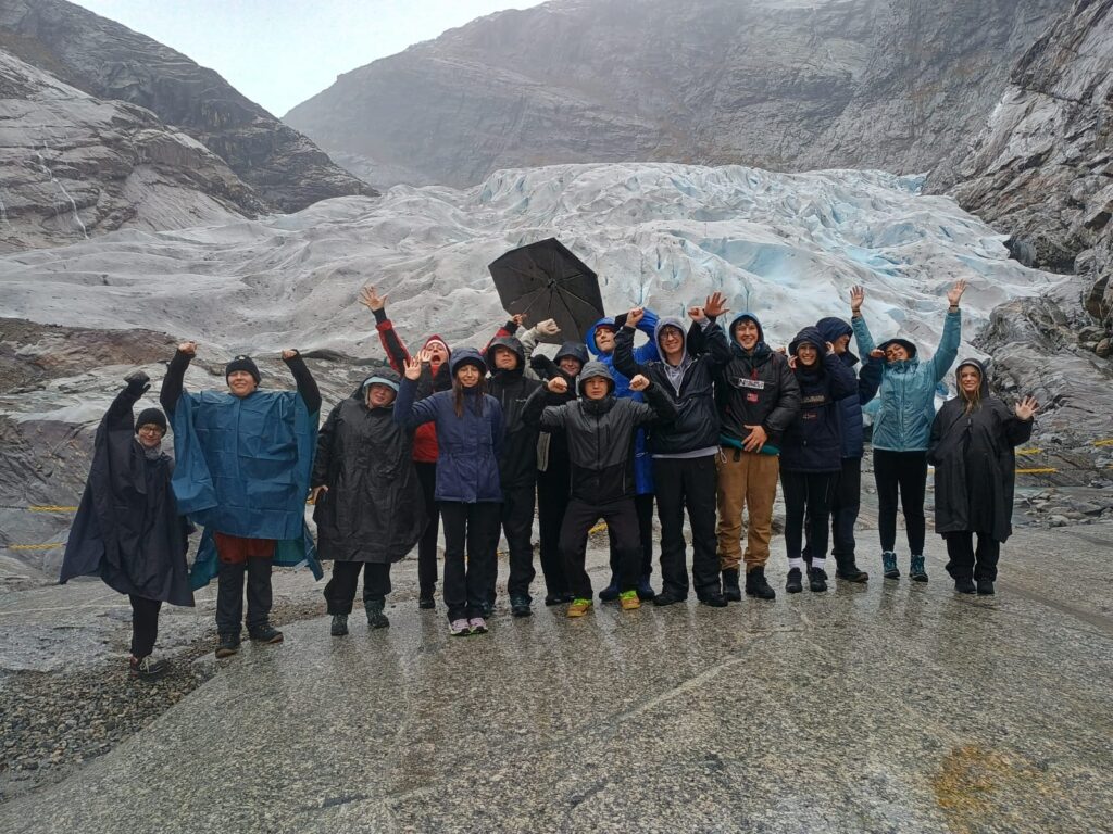 Další den, tedy pátý, následovala zastávka ve středisku Flåm, a pak trajekt přes Sognefjord. Po vylodění jsme se autobusem přesunuli na další místo, kde jsme se po svých dostali k ledovci  Nigardsbreen. Naší skupině, neboli druhému zájezdu, začalo trochu pršet, ale to nás nezastavilo a my si to i tak velmi užili. Celková cesta k ledovci i zpátky byla nějakých 12 kilometrů, a pak jme všichni unavení nastoupili do autobusu a vezli se do malého města Lom, které jsme si prošli, a pak zamířili na další ubytování nedaleko tohoto města směrem na Grotli.