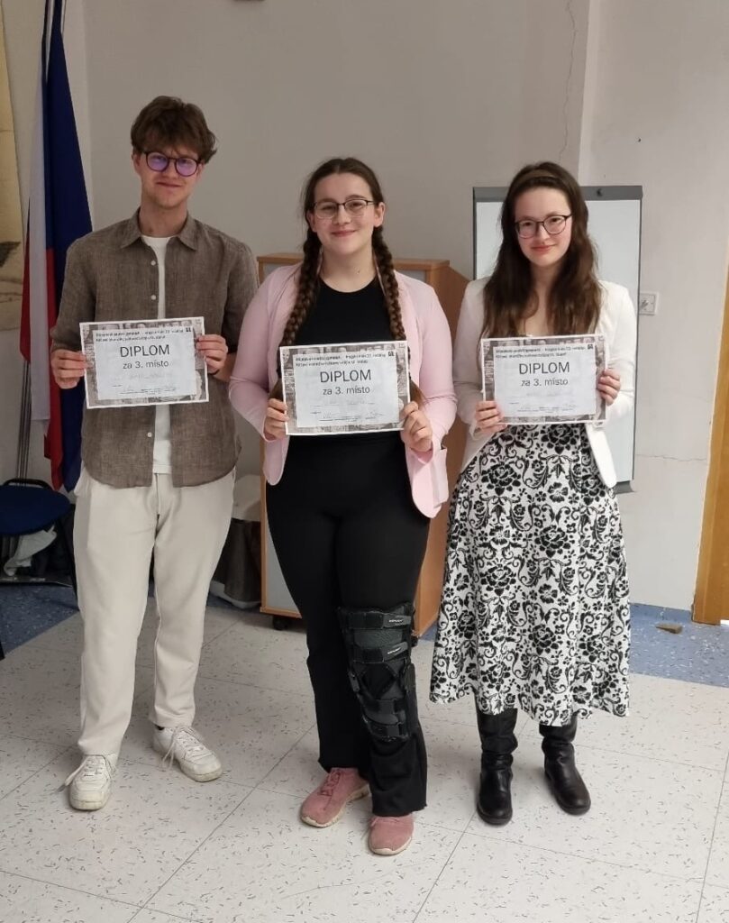 Ve středu 2. dubna 2025 se družstvo naší školy ve složení Jitka Poslušná, Anežka Gajdošíková a Jakub Podroužek zúčastnilo tradiční dějepisné soutěže, do které se pravidelně zapojuje více než 300 gymnázií z Česka i Slovenska. Krajské kolo se konalo ve Zlíně na Gymnáziu Lesní čtvrť a zúčastnila se ho družstva z 11 gymnázií Zlínského kraje. V této silné konkurenci obsadili naši studenti krásné třetí místo a postoupili do celostátního kola, které se bude konat na podzim v Chebu. K tomuto velkému úspěchu jim srdečně gratulujeme.
